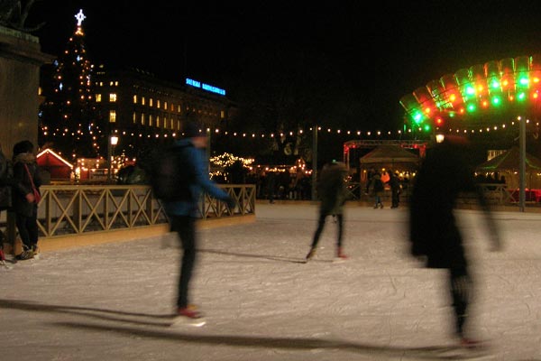 Åk skridskor på någon av Stockholms isbanor under julen. Mys med varm choklad, glögg och pepparkakor.